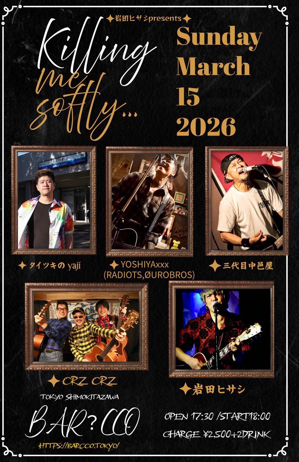 OPEN 17:30 / START 18:00 / CLOSE CHARGE : 前売 ¥2,500- / 当日 ¥- (+2Drink¥1,200)