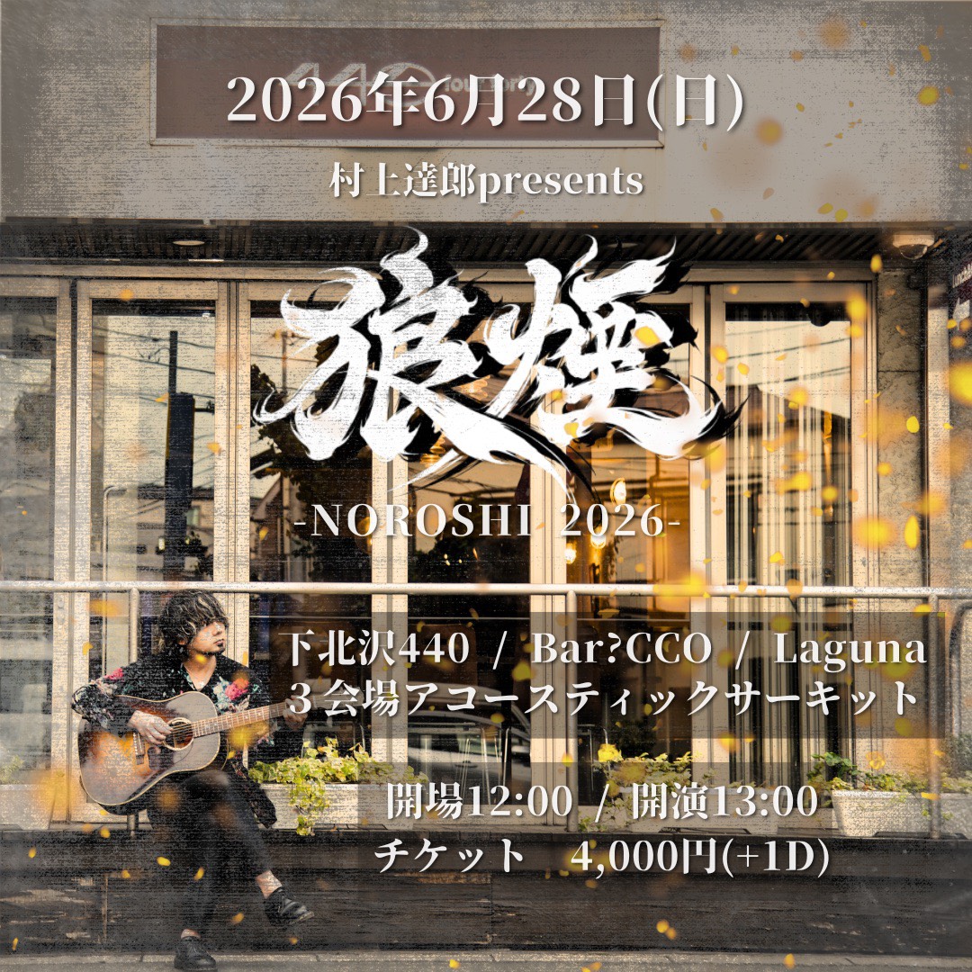 村上達郎presents 【狼煙-NOROSHI-2026】下北沢440、Bar?CCO、Laguna 3会場アコースティックサーキット