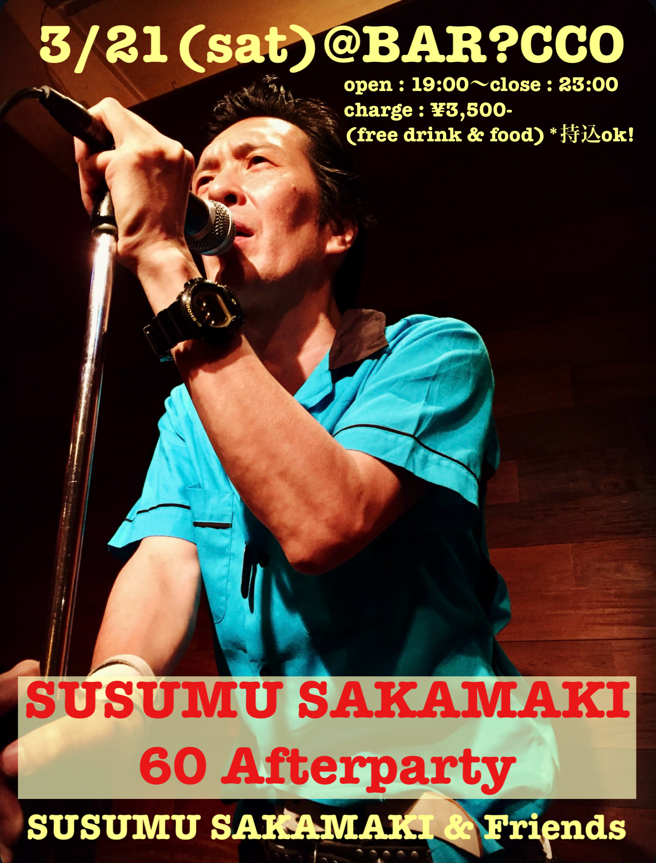 OPEN 19:00 / START 19:00 / CLOSE 23:00 CHARGE : 前売 ¥3,500- / 当日 ¥- (free drink & food)*持込ok