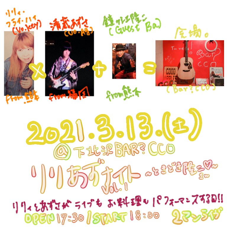 出演 : 清蔵あずさサポート:カニエイッペイ(Per&Cho)OPEN/START 16:00-/19:15-~配信(LO:19:00-CLOSE:20:00-) <配信URL> |