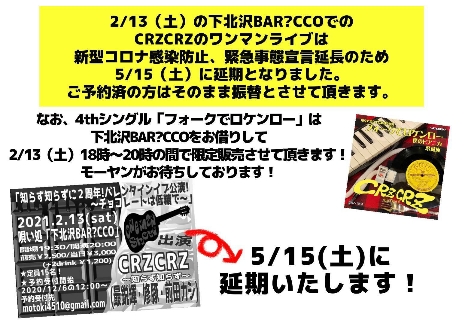 出演 : CRZ CRZ ~知らず知らず~(修豚・前田カシ・最鋭輝 )OPEN 17:30/START 18:00 おかげさまで、予約受付人数に達しております! キャンセル待ち受付は、薔薇屋敷レコードmotoki4510@gmail.comまでご連絡ください。 |