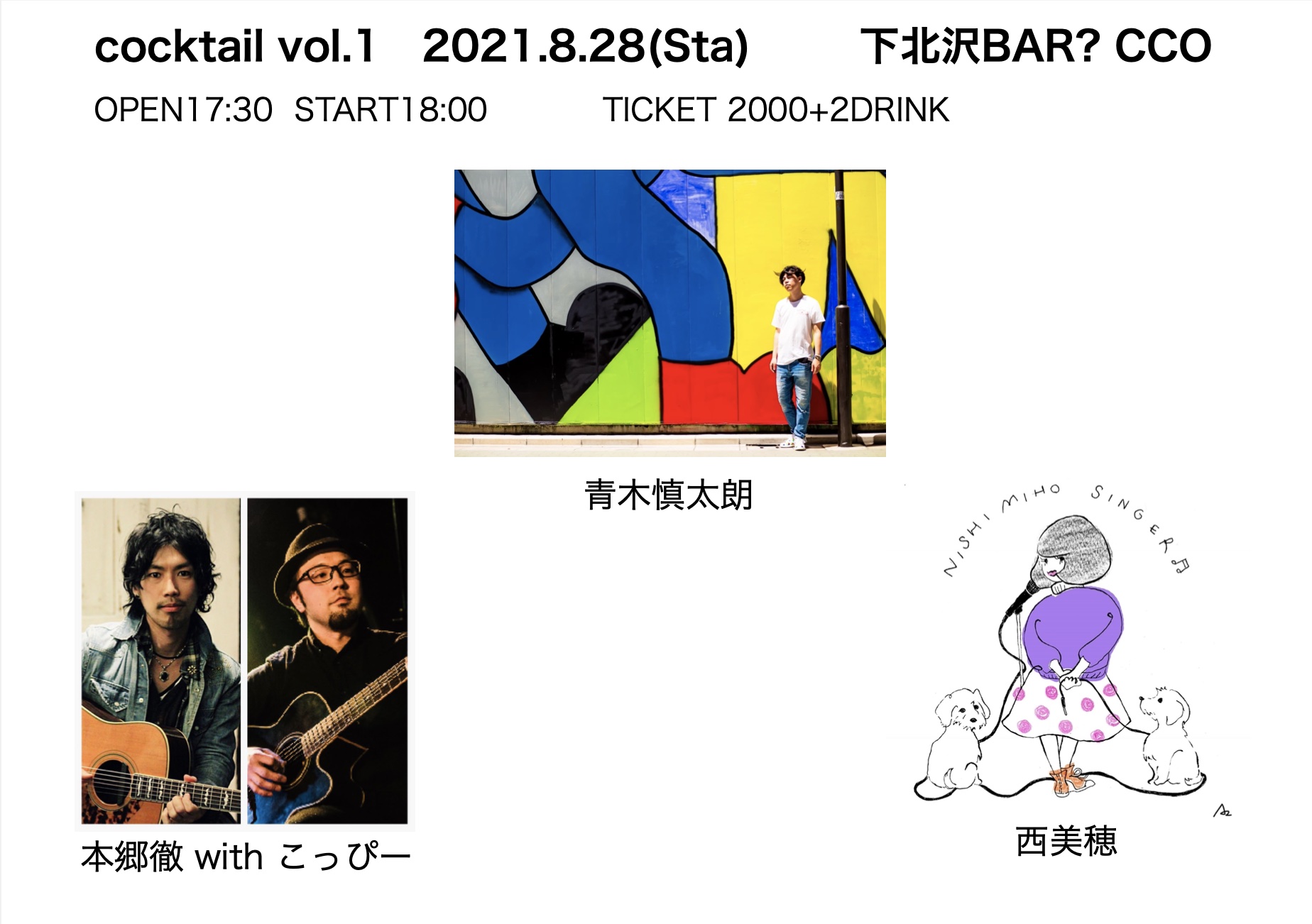 出演:青木慎太朗/西美穂/本郷徹 with こっぴーOPEN 17:30 / START 18:00 予約=各アーティストHP/SNSにて |